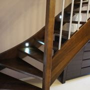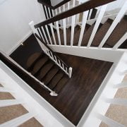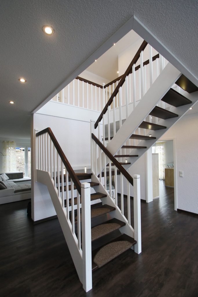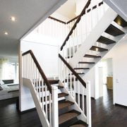 Stufen + Handlauf dunkel gebeizt und lackiert. Wangen, Pfosten + Füllstäbe deckend weiß lackiert.