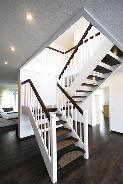 Stufen + Handlauf dunkel gebeizt und lackiert. Wangen, Pfosten + Füllstäbe deckend weiß lackiert.